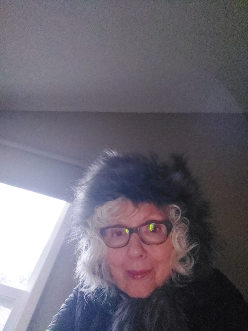 IMAGE: This, a self-portrait, was taken on a very cold day BEFORE it snowed when I went out for a walk on bone-dry pavement. Hat courtesy of Nina Hiatt.